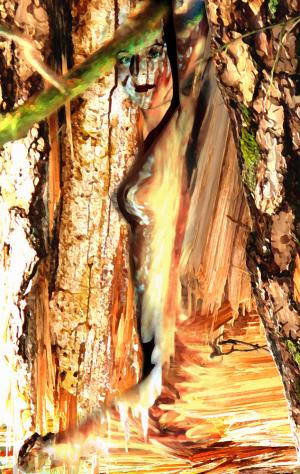 Bei den Bild-Serien bzw. Bildern Baumfee, Metall, On Fire, Rooted, handelt es sich um Mischtechniken, gestaltet aus Bodypainting, Projektion und computertechnischer Bildbearbeitung.